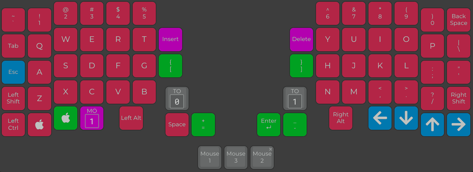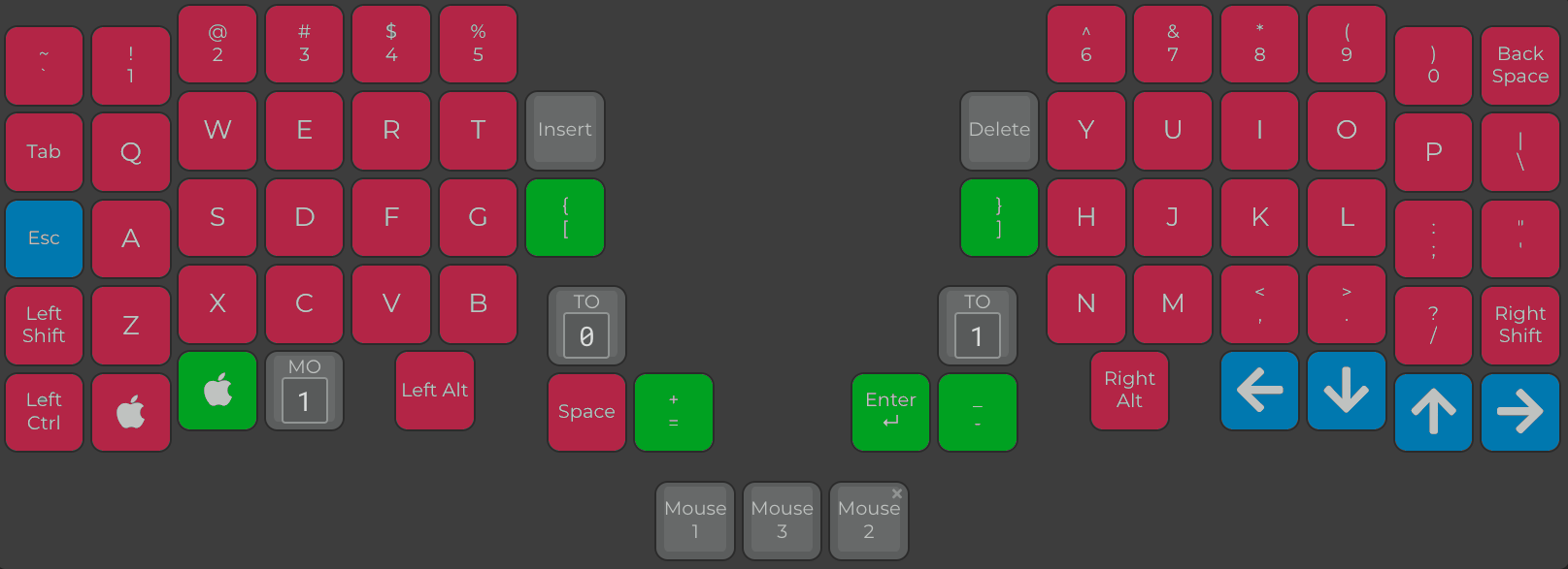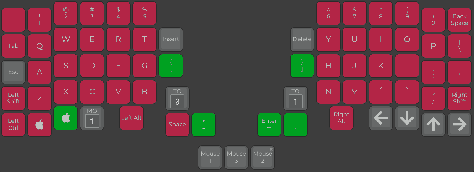 Had we used all of our keys by now, it could be hard to integrate them into the layout. Thankfully we still have two keys in the thumb clusters we can use for layer switching. And they’re just out-of-the-way enough to make sure we don’t press them by accident.