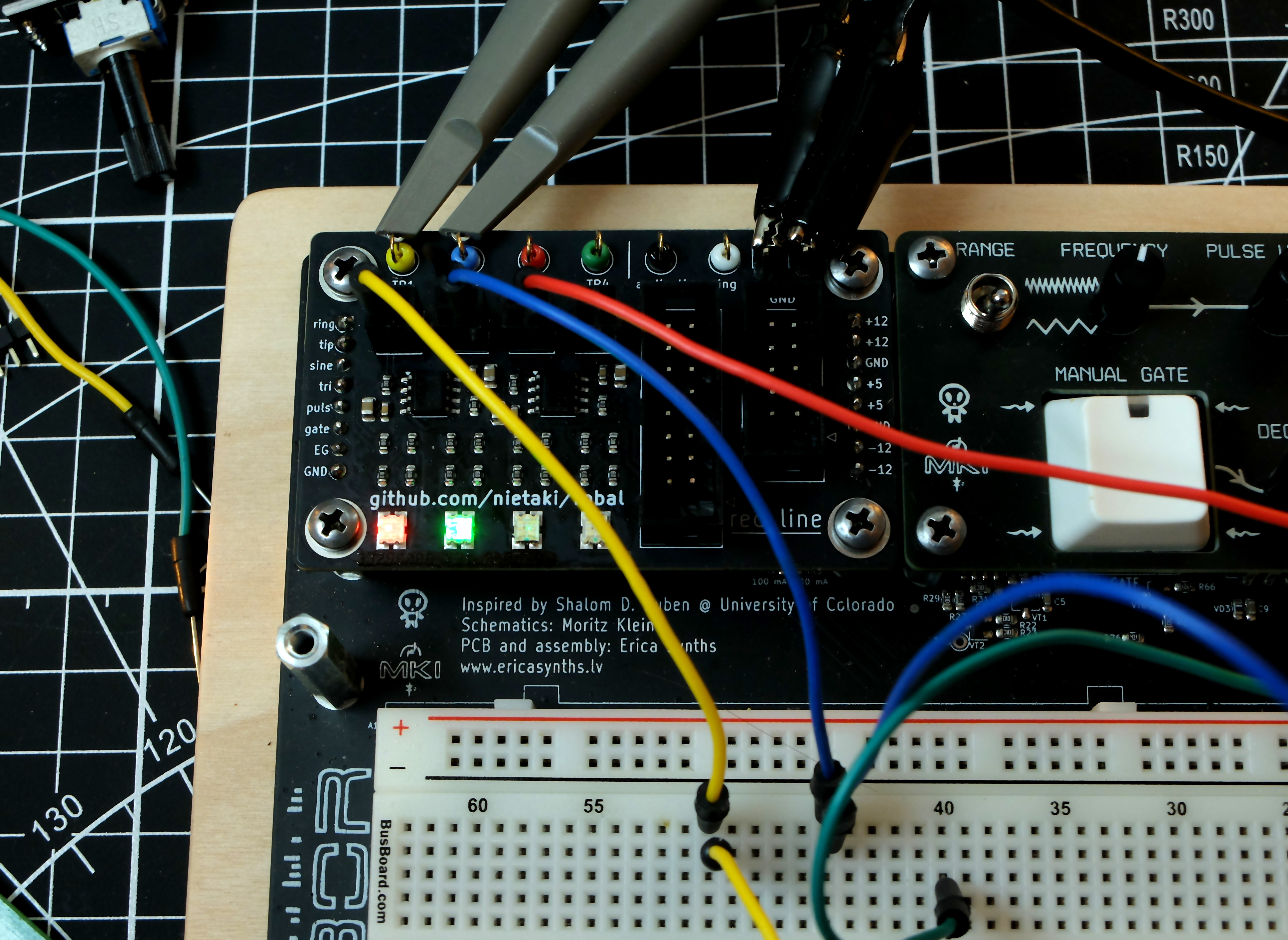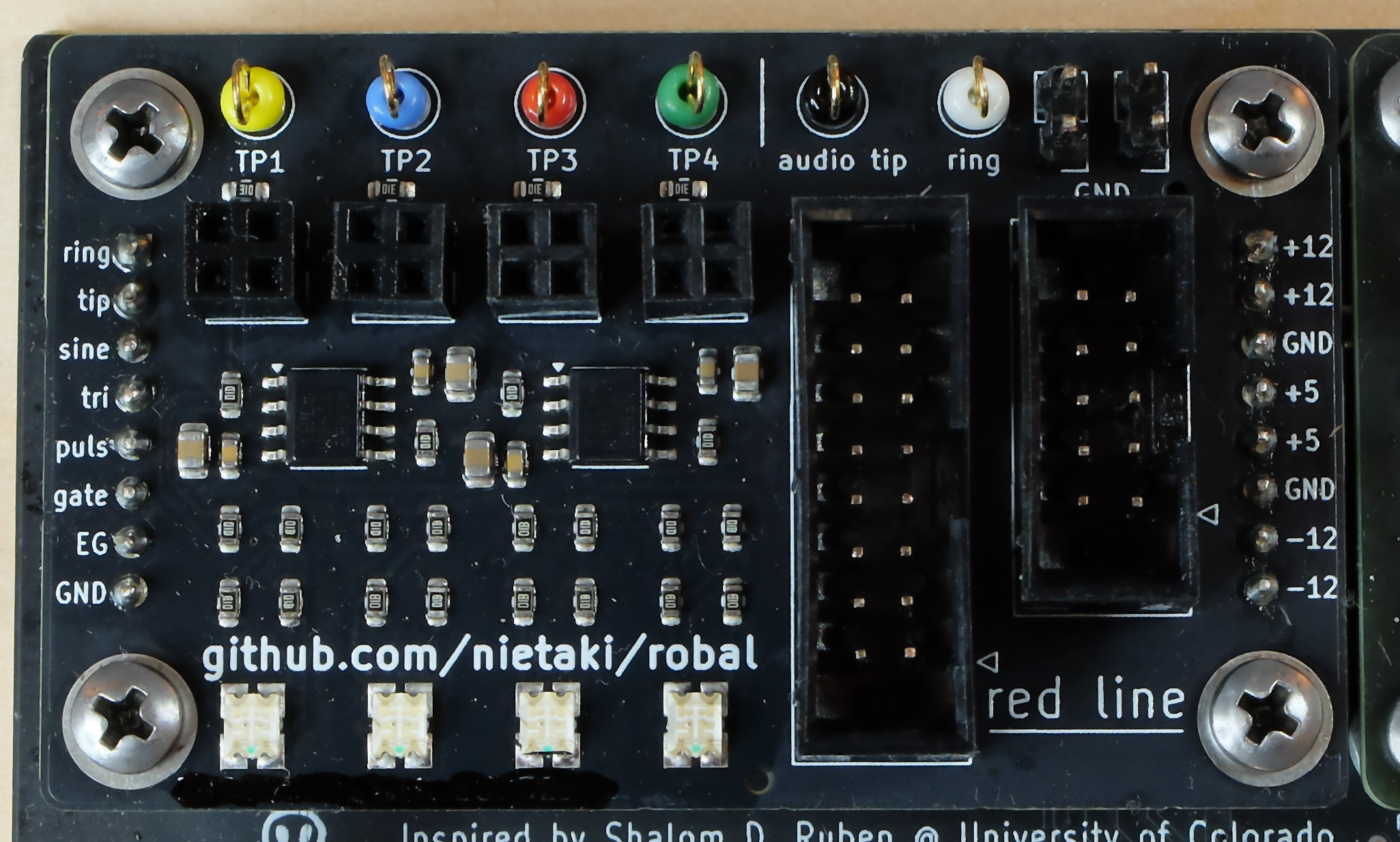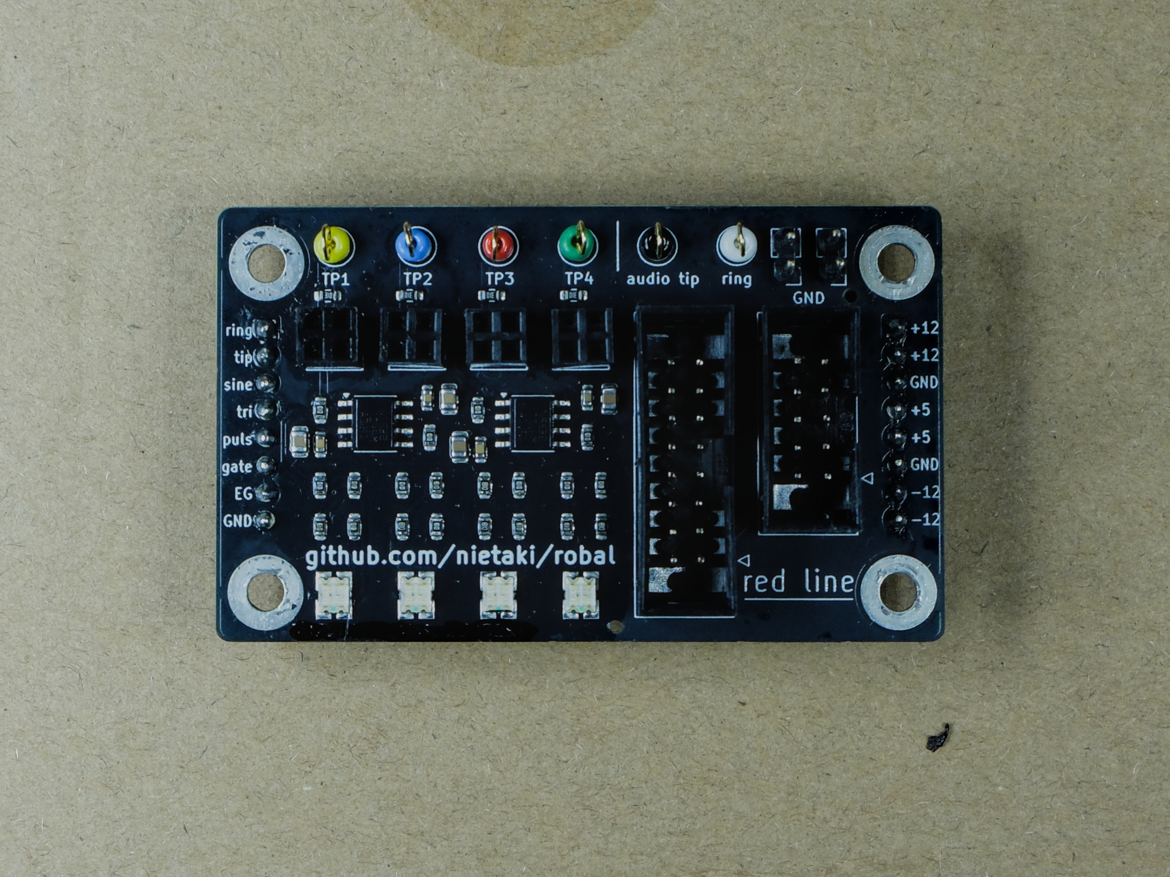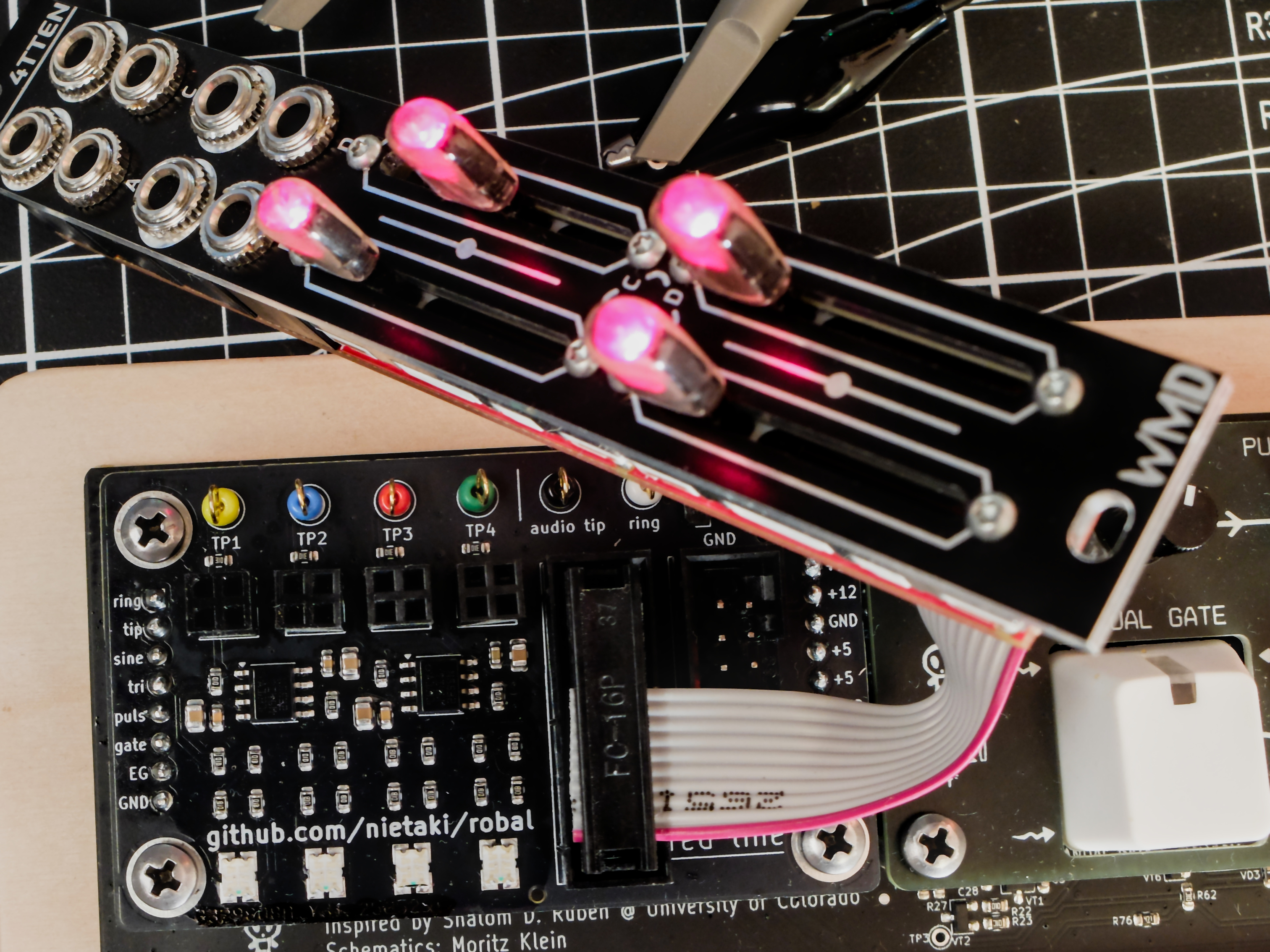 Robal (Polish for “bug”) is an add-on for the Labor which makes circuit debugging a breeze. Four bi-colour LEDs are an instant way to check on the voltage in an arbitrary part of the circuit. For more in-depth analysis you can connect your scope to soldered-in connection points without the risk of messing up the breadboard connections.